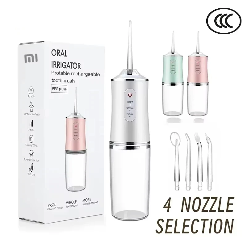 Standard nozzle (daily cleaning), orthodontic nozzle (braces-friendly), periodontal nozzle (gum care), and tongue cleaner (fresh breath).